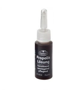 Da die Lösung nicht wasserlöslich ist, dringt sie nicht in tiefe Hautschichten ein, sondern legt einen schützenden Film über die Hornschicht der Haut. Sie lockert überschüssige Verhornungen "mechanisch" auf und erleichtert so das Abtragen. Die in der Lösung enthaltene Trockensubstanz unterstützt die Elastizität und Geschmeidigkeit der Haut. Ein Grund für die besondere Wirkung von Propolis sind die Bioflavonoide. Sie wirken einer Vermehrung von Keimen entgegen. Wirkstoff Propolis-Flüssigextrakt